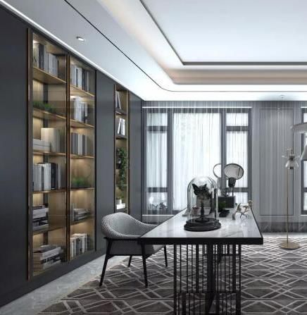 万骊家居轻奢金属、玻璃元素与板门的视觉张力,虚实交替,便于使用者快速的找到书籍。灰色的门板更是彰显近邻天地壮阔,厚载心中盛境。