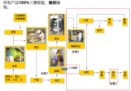 TOTO:所有工厂为日方独资工厂,各厂区均沿用统一的管理制度,严格把控产品质量。在生产管控体系方面,相比一般坐便器生产流程(制浆——造型——干燥——检坯——施釉——烧制——抽检),TOTO有二次施釉,第二次施的就是TOTO专利的智洁釉。此外,对于TOTO坐便器:全部100%经过三重检验,且100%经过水洗检查,采用TOTO独创的人造污物实验,严格控制产品质量。对于TOTO台盆:全部100%进行热水检查,并做急冷急热测试,解决洗脸盆家中冷热炸裂安全问题。