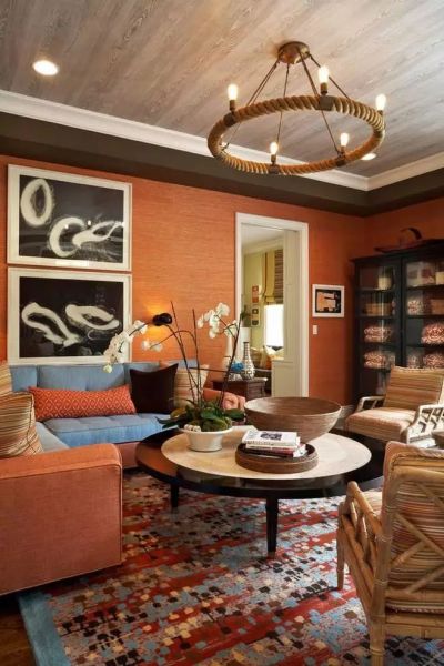 爱马仕橙在时尚界有着极高的地位,无论是演绎文化底蕴深厚的新中式,诠释中西合璧的文化碰撞,还是打造异域风情,爱马仕橙可以活力时尚,可以沉静尊贵,而且善于与各种蓝色褐色搭配,演绎不同的神秘风采。当文化底蕴深厚的新中式风格邂逅爱马仕橙与潜水蓝,将经典中式元素与色彩完美结合,融入现代元素,大面积的爱马仕橙背景,加之潜水蓝色的花鸟装饰画,细节的精雕细琢,崇尚自然情趣,充分体现出中国传统美学精神。如今混搭风盛行,以橙色为主色基调的室内装空间,加上乡村风家具的铺设,古典装饰画元素的加入,有着浓厚的田园风情,古典淡雅的同时不失欧式的高贵华丽,而且在色彩上,加入了柔和浅淡的原色系,丰富空间层次,跳跃惹人爱。