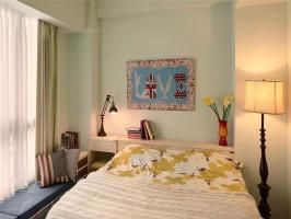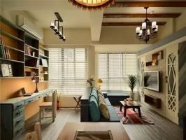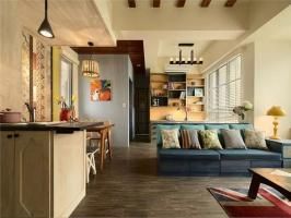 快节奏、繁华的城市当中,总希望有安静的栖息之地,感受到安逸舒适自由的生活,深色地板结合彩色家居搭配结合,空间区域对比划分明确,使空间充满世外桃源之感,水蓝色的美式沙发拉高客厅清爽度,搭配国旗图样的地毡与碎花抱枕,增添度假风格。