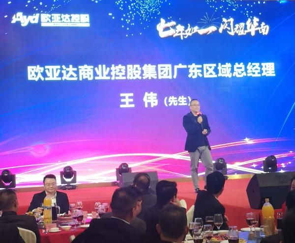 2019年1月15日下午6点,欧亚达控股集团华南区域《七年如一,闪耀华南》新年团拜会于广州市金沙洲恒大御景半岛恒大酒店隆重举行。欧亚达商业控股集团董事长兼总裁徐建刚先生、常务副总裁赵红平先生、营运中心总经理刘思材先生、广东区域总经理王伟先生、广东区域6个门店总经理及员工、意向进场商户等200余人云集一堂,共同见证“七年如一 闪耀华南”——欧亚达商业控股华南区域2019年年会。