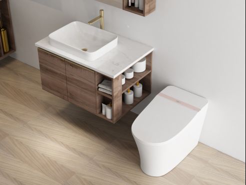 非常巧思地加人性化的设计,多层实木柜主柜的侧边有开放式的隔间,较大的储物空间可多放备用纸巾和马桶清洁用品,改变传统厕所专门在墙壁上安装滚纸筒或抽纸盒的方式;同时很多人会习惯在如厕时刷手机信息,或者阅读杂质,这个储物空间也能起到很好的物品放置功能。
