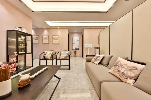 一份成功的家居设计不仅能够弥补原房型上的缺点并发挥成亮点,还能用传递生活空间的美好,达到人物合一的高度和谐。百安居在出品家居设计方面具有丰富的经验和独特的见解。以百安居B&T home新零售家居智慧门店内新中式样板间为例,室内以温润的米色与深棕木质为整体基调,光面纹理大理石地板通透明亮,素色的墙面简约而典雅,营造出一种静谧而又灵动的氛围,赋予有限的空间无限的遐思;深棕木质家居古朴厚重,同时极具线条感,使空间感朴实而流畅,散发着浓郁的文化气息;经典的中式靠椅与新式沙发并存,硬朗与慵懒两种元素碰撞出中式的现代感,配套印有泼墨山水画的抱枕与壁画相呼应,为空间增添一抹素雅的诗意;家具在灯光的映衬下散发着古朴典雅的东方美学自然韵味,又有惬意的轻奢质感,尽显中式古典朴高雅与现代简约舒适的完美融合。