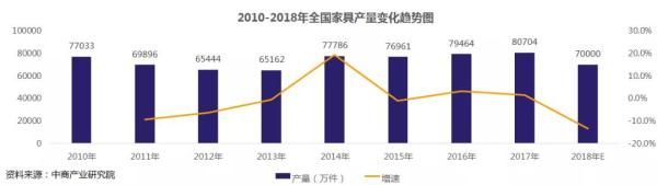 近年来,我国家具行业生产规模扩张速度受经济大环境以及房地产行业的直接影响,呈现波动周期波动的态势。2017年,我国家具产量为80704万件,同比微涨1.6%;据前10个月全国家具产量数据测算,2018年我国家具产量约为70000万件,出现约13.3%的明显下滑。