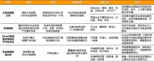 家居物流行业现在主要有四大类型:第一类是大型全网型公司、第二类就是各种专线联盟、第三类是以SaaS系统做支撑的纯平台化企业、第四类是近几年崛起的专业家居物流企业。