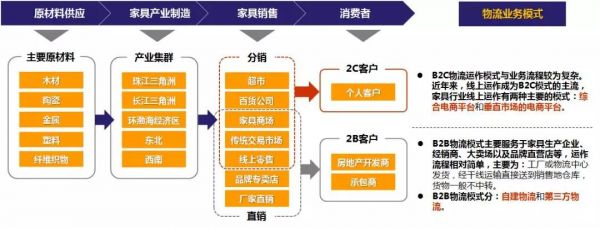家居物流市场总的来说,物流模式以仓配一体为主,按照物流运营模式,市场主要分为B2B和B2C两大模式,相应地形成了“干线+核心仓”和“支线+配送仓”两大环节。