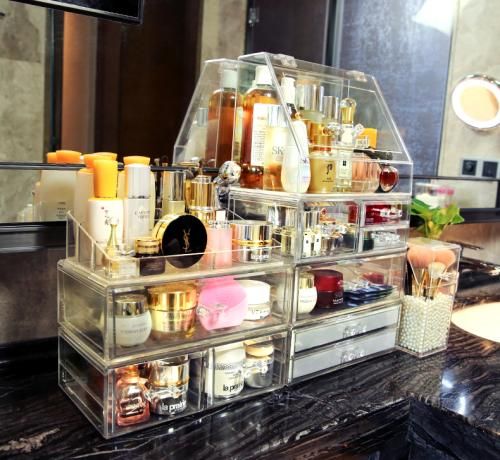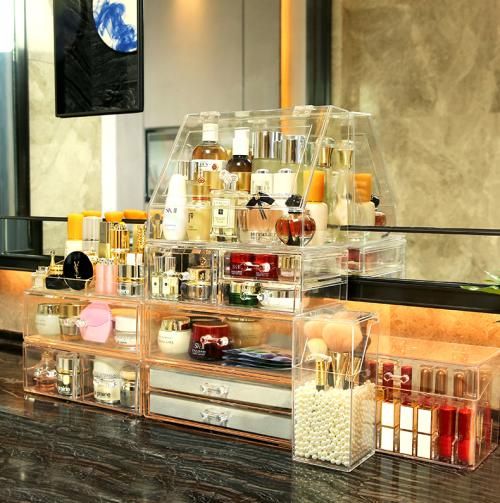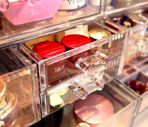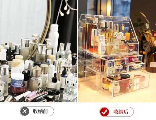 亚克力透明盒子,方方正正的极简风,下方带两个窄抽屉,格子间的,素净、精致、安静而美丽。三层像小房子的设计,科学规划收纳空间,让化妆品和护肤品有各自的空间,一层一层叠加起来,设计得恰到好处。