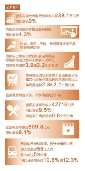 根据国家统计局发布的数据,2018年全国实现社会消费品零售总额38.1万亿元,同比增长9%。时尚、品质、节能、智能等升级类产品受到市场欢迎,服务消费增速较快,文娱消费提质扩容。从年货市场的消费特点看,除了食品、饮料等快速消费品,电子产品、家居用品,甚至汽车,已经成了增长最快的消费品。