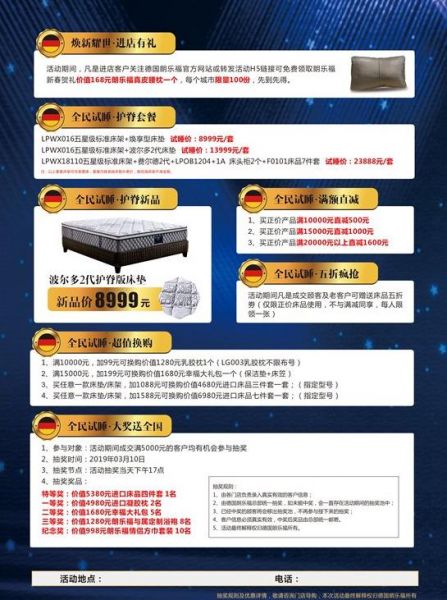 全场购物满相应数额,即可享受加99元可换购价值1280元乳胶枕1个/加199元可换购价值1680元幸福大礼包一个;买任意床垫/床架,即可享受加1088元换购价值4680元进口床品三件套一套/加1588元换购价值6980元进口床品七件套一套。