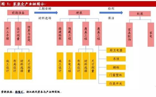家装产业链主要包括设计、硬装、软装三大块业务。位于产业链前端的设计、硬装等业务,传统来讲是由设计公司、家装公司包揽;而软装业务,则包括家具、家电产品的销售。