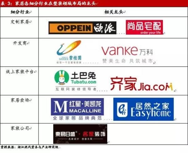目前涉足整装领域的玩家主要包括以下五大类细分行业的龙头企业: