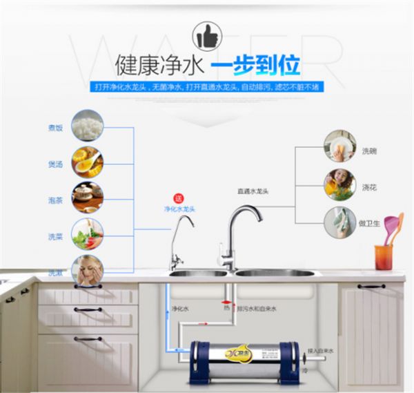 不少家庭认为只需要安装厨房净水器就可以了,这种净水器一般安装在橱柜下,所以也称为"厨下式净水器"。厨房净水器净水的范围区域有限,仅局限于厨房,只满足厨房饮用水需求,却不能满足家庭其他场所的饮用水需求,比如卫生间、客厅等。