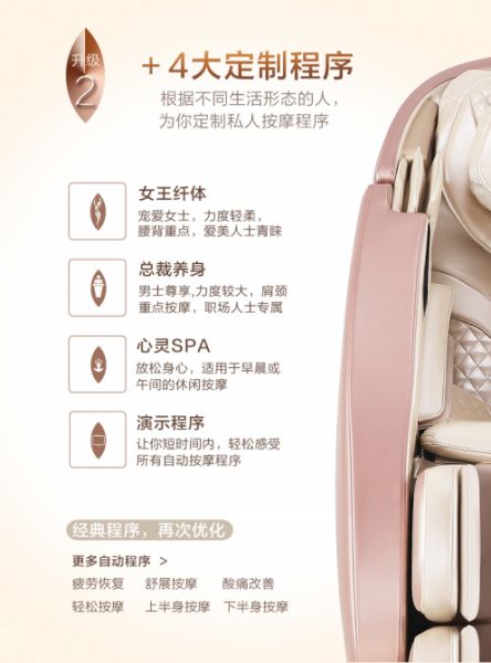 程序越多选择越多没毛病,但这是有前提的,并不是会“敲打揉捏”的程序就是好程序,不科学的胡乱敲打反而可能会对健康造成伤害。某些低品质按摩椅为了在程序数量上取胜,宣称有上百套按摩程序,而在程序设计方面粗制滥造。一般来说有实力的品牌都会斥巨资用于程序研发,还会与国内外医疗院校、按摩大师合作,改良按摩程序及机芯走位,这些内核是很多小品牌难以模仿的。
