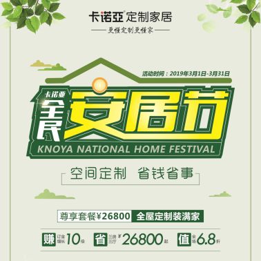 据悉,卡诺亚“全民安居节”3月1日正式开始,将持续到3月31日,想要空间定制有品位、颜值高、健康环保的家装、家具、家饰、家电,可亲临卡诺亚当地专卖店,或通过网上预约,以便早日实现安居梦。