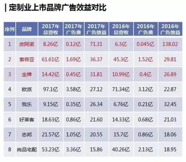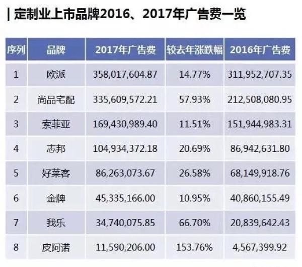 能看到欧派、尚品宅配在广告投入方面均超过3亿规模,如果去掉皮阿诺的高涨幅外,其余7家定制品牌平均年度广告投入较前一年涨幅达到29.8%。