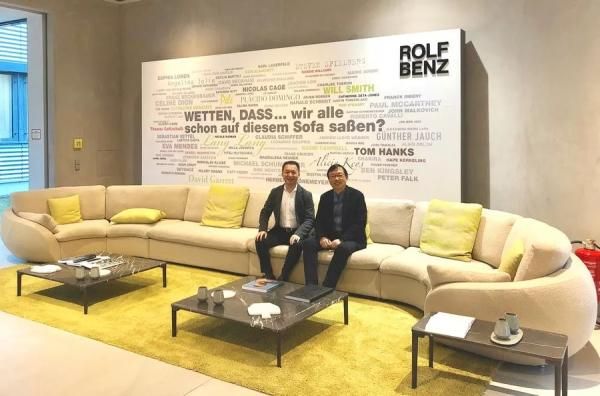 在RolfBenz总部展厅最标志性的沙发上。左为顾家集团国际产业事业部总经理 张建闻