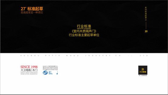 创始于1998年,大卫,行业标准化领导者!“一般企业做产品,优秀企业做标准”大卫20年,是《实木地板通用要求》国际标准、《地采暖用实木地板技术要求》等8项国家标准、14项行业标准以及4项团体标准主要起草单位。国标起草就像撰写教科书一样,是一种国家认可、行业普遍执行的技术准则,是一张国际通用的高端企业名片。2012年至今,大卫研发检测中心连续7年通过国家CNAS实验室认证,实验结果可获全球54个国家与地区实验室认可。大卫地板27项标准主要起草单位,是高度更是一种责任,进一步彰显了大卫在行业中的地位和强大的市场影响力,亦是大卫地板以及大卫·阿玛蒂木门的高品质、标准化、技术实力作强力注解。