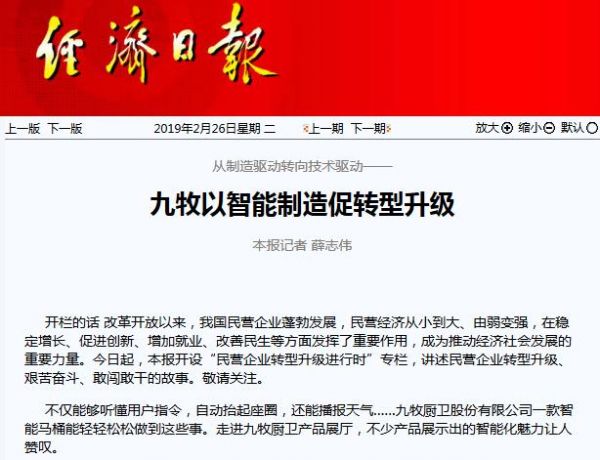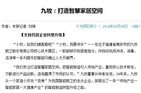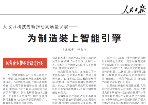 今天,《人民日报》发表了题为《九牧以科技创新推动高质量发展——为制造装上智能引擎》,从传统产业到人工智能,从智能家居再到大健康产业,九牧一步步向世界顶级先进制造企业迈进。