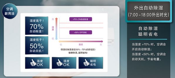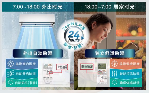 搭载外出除湿技术的松下ES系列空调,当湿度过大(大于70%)时,空调将自动开启运转除湿模式进行除湿,完成除湿后空调可自动关闭。外出除湿是全自动模式,仅需开启松下ES系列空调一键除湿功能,无论上班、外出、在家均可实现快速操作;搭载舒适除湿技术的ES系列,根据湿度与温度双重维度,功效媲美除湿机,打造舒适体验区;此外,这款空调还可根据春夏秋冬四季室温变化,自动调整室内湿度,打造舒适的恒温恒湿区。