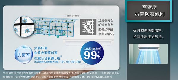 不仅如此,松下ES空调还能持续吹出清洁气流。松下为ES空调搭载了高密度抗菌防霉滤网。掀开空调面板,我们就能看到这块高密度抗菌防霉滤网,据测试数据显示,这块滤网24小时的抗菌率高达99%,过滤器内含的铜类菌剂能使尘中的杂菌灭活化。