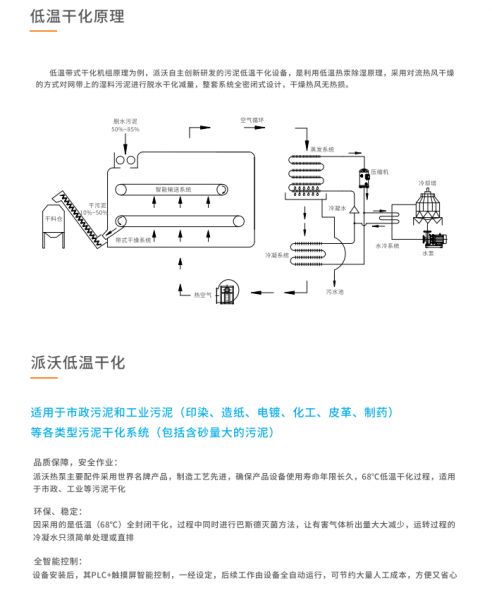 派沃创新研发的污泥低温干化设备,可直接将污水或含水率83%污泥干化至含水率10%-30%干泥,减量高达90%,有效杀菌高达90%,低能耗、无污染,可广泛运用于市政污泥和工业污泥(印染、造纸、电镀、化工、皮革、制药等)干化减量,10%-30%含水率的干泥后期可进行气化、掺烧、堆肥或建材原料等无害资源化处置。