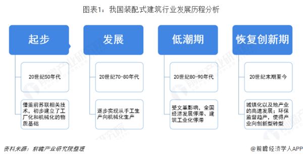 我国装配式建筑行业起步于20世纪50年代,当时借鉴了前苏联的相关技术,建立了初步化的产品生产工厂,也带动了国内机械化水平的提高,到了70年代,行业发展随着机械化水平的提高逐渐摆脱了手工生产而是向机械生产逐步过渡,由于受文 革影响,行业经历了一段停滞期,直到20世纪末才渐渐发展起来,如今国内装配式建筑厂商越来越多,在环保监督趋严的环境下渐渐向产品创新型企业转型,使得装配式建筑进入高速发展及创新期,尤其是2016年以来,国家及地方多次出台指导性、惠普性及鼓励性政策,促进了装配式建筑产业的快速发展。