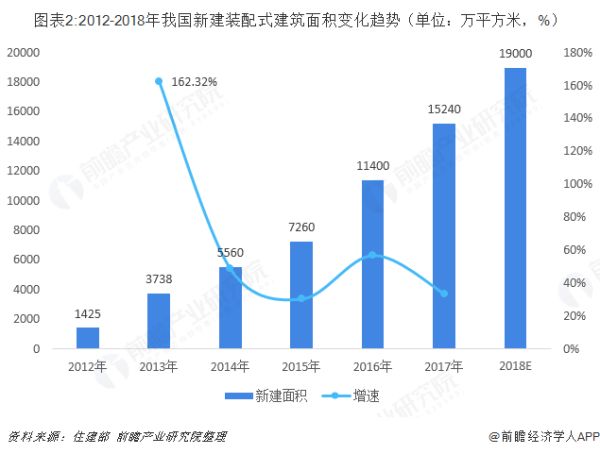 近年来,随着经济的快速发展,预制构件加工精度与质量、装配式建筑施工技术和管理水平的提高以及国家政策因素的推动,预制装配式建筑重新升温,并呈现快速发展的态势。据统计,从2013年开始,我国装配式建筑新建面积呈快速增长趋势,尤其是在2013年,国内新建装配式建筑面积3738万平方米,较2012年同比增长162.32%,行业发展到2017年,新建装配式建筑面积已经达到15240万平方米,随着我国建筑工业化程度的进一步提高,装配式建筑行业将会继续呈良好发展态势,预计到2018年底我国新建装配式建筑面积将达到19000万平方米。