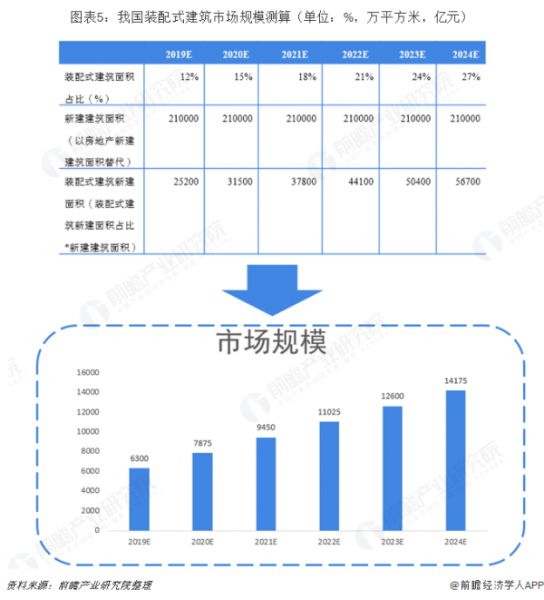 因此根据住建部发布的装配式建筑造价参考依据,以2500元/平方米(考虑到技术水平上升和物价提高对价格水平带来的不同影响,假设未来几年造价不变)为基础,以房地产新建建筑面积替代城镇新建建筑面积进行测算,及至2024年我国装配式建筑市场规模将超过14000亿元。(来源:前瞻产业研究院 江望月)