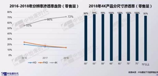 押宝人工智能,至少从消费者需求的角度来说,彩电企业不用担心市场不接受。而另一个不会错的押注,就是4K电视,中怡康数据显示,2018年4K电视零售量渗透率已达72%,55吋及以上大尺寸的渗透率更是接近100%,在大尺寸电视逐渐成为趋势的现在,4K电视是真正的“标配”。