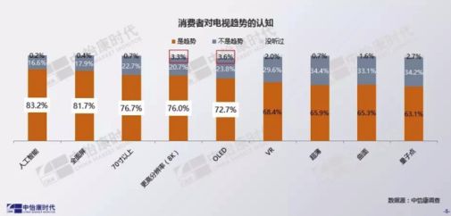 中怡康数据显示,在消费者对电视趋势的认知调查中,有83.2%的消费者认为人工智能是趋势,在所有彩电新技术元素中,人工智能的认知和认可度最高,从另一个角度来说,八成以上的消费者希望其未来家中的电视是人工智能。