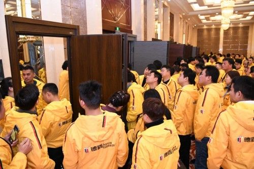 2019年2月26日,德盾发布会在武汉洲际酒店举行,全国经销商代表不辞辛苦的从全国各地赶过来,都想跟上新年这一波浪潮。舞台前面有一大片显眼的红色盖布,盖布下面是新品样品门,无疑是今天的亮点。
