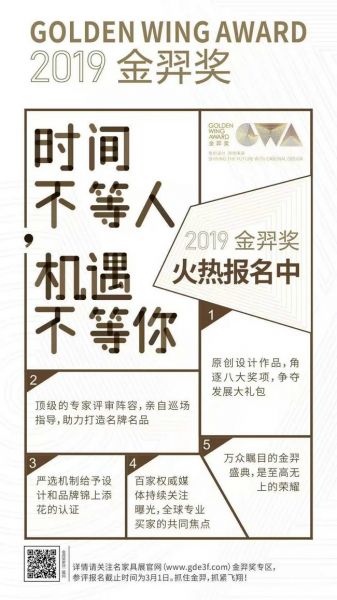 如何报名参加金羿奖?直接扫描以下二维码进入报名链接,按参评奖项分类报名,也可在名家具展官网www.gde3f.com 参展商专区-金羿奖入口报名。