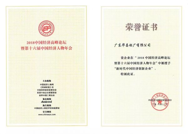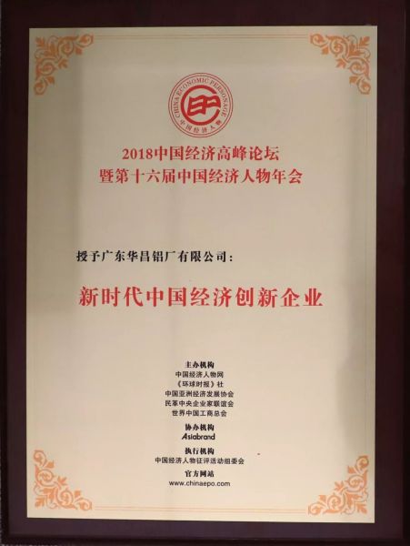 2018年12月28日至29日,由新华网、《环球时报》社和中国亚洲经济发展协会联合举办的“2018中国经济高峰论坛暨第十六届中国经济人物年会”,在北京隆重举行。广东华昌铝厂有限公司荣获企业大奖:“新时代中国经济创新企业”称号,成为该大会行业首个获奖企业。