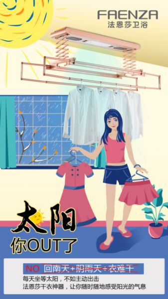 那么什么办法都不用,每天坐等太阳吗?NO,NO,NO!还在苦苦等候太阳的你已经OUT了,回南天、阴雨天、衣服难干,这些通通都不是问题,法恩莎“干衣神器”来帮你搞定!