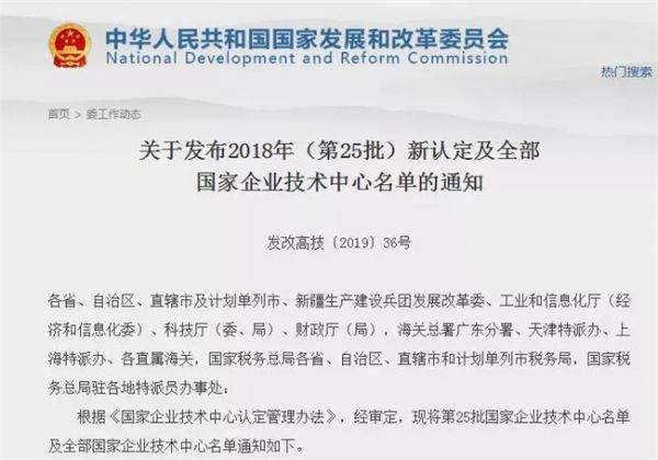 据悉,国家企业技术中心是一项含金量十足的资质认证,由国家发展改革委、科技部、财政部、海关总署、税务总署五部委联合认定,以强化企业技术创新主体地位,引导和支持企业增强技术创新能力为目标。入选企业需接受基于数十项指标的技术创新能力综合性评定。对于入选“国家企业技术中心”的企业,国家也将给予更大程度政策优惠,以鼓励企业不断提高研发创新能力。