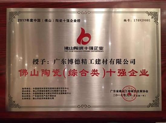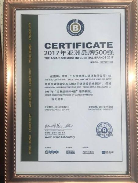 在陶瓷及卫浴建材行业里,针对含金量高的权威性奖项角逐,博德每一次都给予高度重视。今年是博德迈入陶瓷生产的第17个年头,已荣获国家级不同类型证书30多项,涵盖:中国建材企业500强,中国民营建材企业100强、企业信用评价AAA级信用企业、中国陶瓷十大品牌、陶瓷十强企业等;省级区域性/陶瓷协会推荐品牌证书80多项;各类产品国家检测报告、合格标准等达200多项。