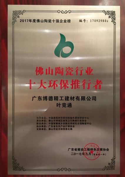 同时,这也是博德公司副总经理叶竞通多年坚持的奋斗目标,致力推进绿色环保的事业发展,并于2017-2018年,荣获佛山陶瓷十大环保推行者荣誉称号。