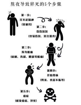 别问什么是健康生活,道理大家都明白。有时不愿改变调整,也只是社会新闻没戳到痛点。如果年前那位因过劳疲而猝死的X为前高管正是你的票圈好友,你还会主动放弃晚间睡眠时间,作死与自救并存,狂嗨与养生齐飞?要知道人很脆弱,从熬夜到猝死也只需5个步骤而已。