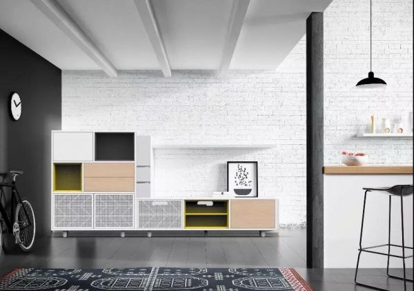 电视柜的组合比较大胆,三个柜体中同时融入了木板门、镂空门和黄色配色,不同材质和色彩的冲突让电视柜显得尤为别致。