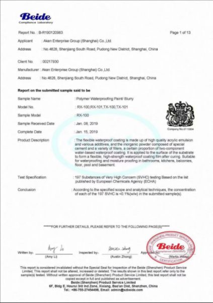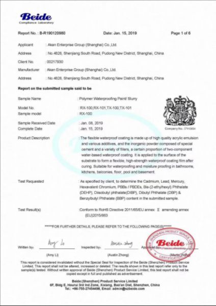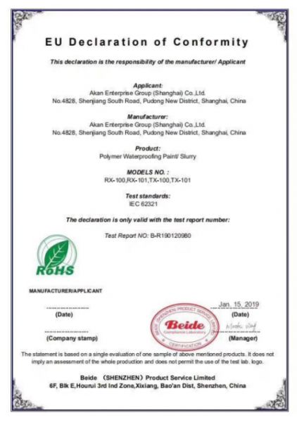 朴乐防水通过RoHS、REACH这两项认证也足以说明朴乐防水涂料为绿色产品,无毒无害无污染、落实我们的口号“朴乐防水、涂个安心”让每位选择我们产品的用户都可以安心使用。