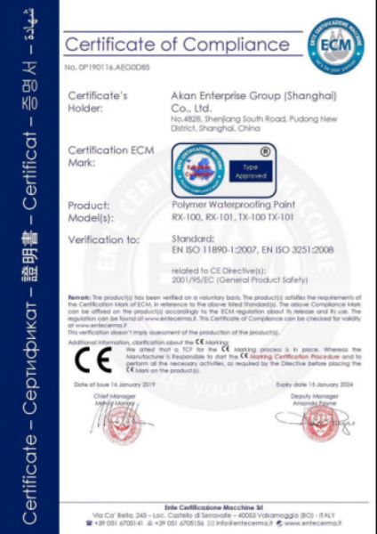恭贺爱康企业集团朴乐防水品牌荣获CE欧盟等系列认证