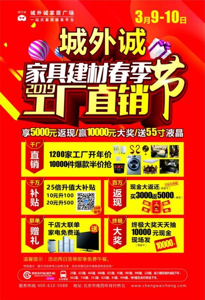特别是3月9日至3月10日的“2019城外诚家具建材春季工厂直销节”,也是本次开年爆破营销的重点活动。活动期间,在城外诚五馆购物,单笔合同单实付满3000元,即可参与3月9-10日的大抽奖,抽取最高价值10000元的现金礼券;跨品牌购物3单以上即可享受联单好礼,免费领取电视、冰箱、洗衣机、锅具套餐、扫地套装等好礼。同时,商场还推出五馆通用的100元补贴券和家具馆、中式馆、欧美馆专用的500元补贴券,顾客自2月27日起,每天早九点,可通过城外诚微信公众号秒抢补贴。