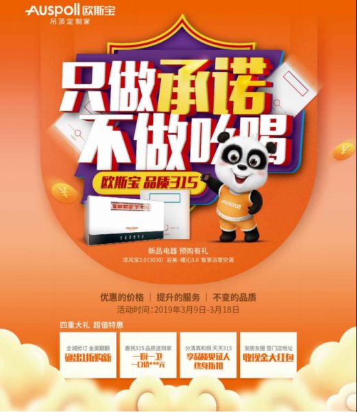 籍此315消费者维权日到来之际,“欧斯宝315品质日”也将在3月9日拉开序幕,用超长10天“价”期,回馈您的整年信任!凉风宝2.0(3030)、浴美·暖沁3.0、智享浴室空调三款新品全面开启预购,预购即送豪礼,更有萌萌哒品牌吉祥物“福宝”可爱来袭。