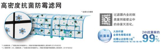 松下新品空调HE系列还非常重视产品内部“自洁”,采用高密度抗菌防霉滤网,内含铜类菌剂能使尘中的杂菌灭活化,有效阻断大肠杆菌、金黄色葡萄球菌,24小时抗菌率高达99%,避免空调内部霉菌滋生,持续吹出洁净新风。