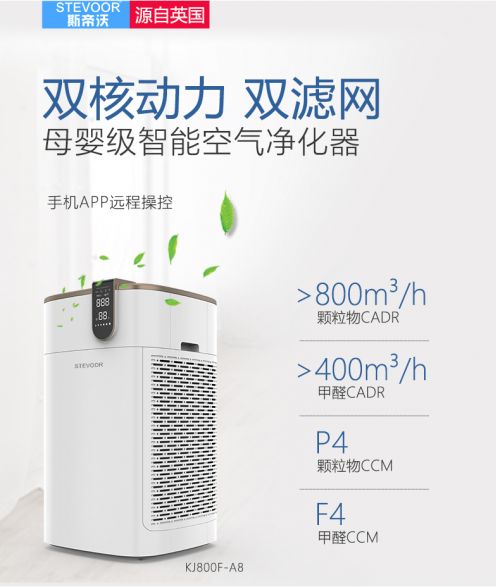 斯帝沃发布的新产品A8,颗粒物CADR值高达800m³/h ,甲醛CADR值高达400m³/h 采用英国母婴级技术结合中国空气情况研发,采用了光感应技术和纯天然椰壳活性炭,不仅仅提高了空气净化精度,更加提高了产品体验,专门为新房装修入住急需去除甲醛、甲苯等有害物质的消费者设计的一款符合全球国标的产品,采用双核动力系统和双过滤系统可以快速达到去除甲醛、甲苯的效果。