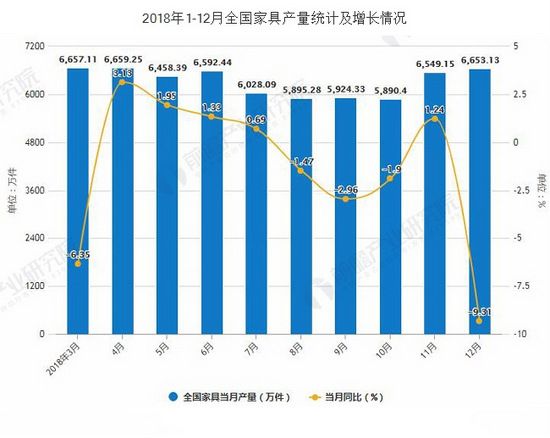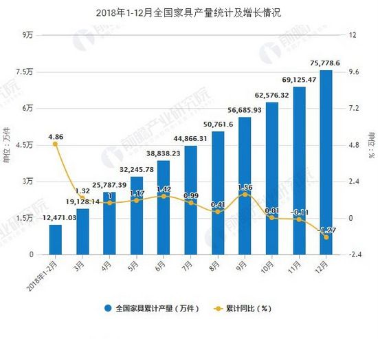 2018年全年全国家具产量突破7.5亿件