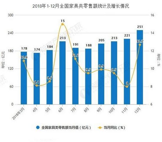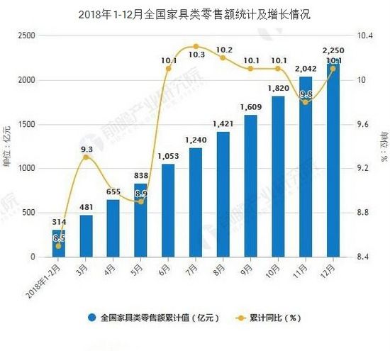 从家具类零售情况来看,2018年12月家具类零售额达为251亿元,与去年同期相比增长12.7%。累计方面,2018年1-12月全国家具类零售额达2250亿元,同比增长10.1%。
