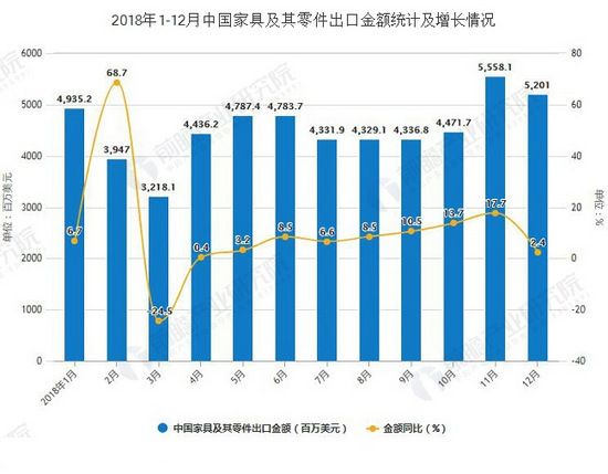 2018年1-4季度中国家具及其零件出口金额波动幅度不大,呈震荡上行;2018年4季度中国家具及其零件出口金额相比3季度增长17.18%。2018年12月中国家具及其零件出口金额为5201百万美元,同比增长2.4%。