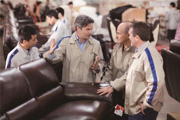 创始人Simon Lichtenberg(右二)和设计师、研发人员共同探讨如何改良款项,提升工艺
