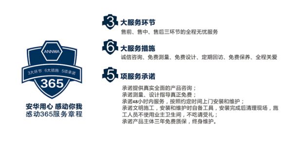 十多年的温暖行动已经让安华人的服务意识根深蒂固,安华卫浴全国3000多家营销服务网点始终贯彻“感动365服务”体系,成立专业服务团队,全面推行售前、售中、售后三环节的全程无忧服务,以专业的态度和优质的服务感动消费者。